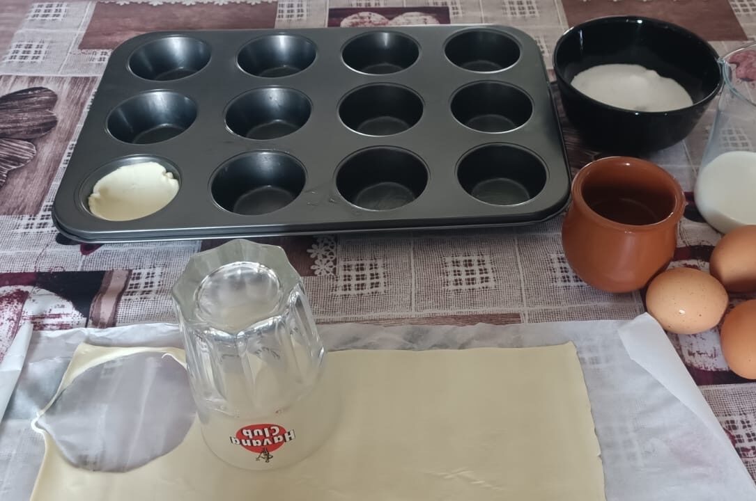There are two ways to handle the pastry. The classic method involves rolling the rectangular sheet into a tight log and cutting it into 12 equal spirals. However, for this easy home version, I recommend a faster 'shortcut' method. Simply lay out your cold puff pastry sheet and use a round cookie cutter (or a drinking glass) to cut out 12 discs. Grease a 12-hole muffin tin with a little butter. Place a pastry disc into each muffin cup. Using your thumbs, gently press the dough against the bottom and up the sides to line the cup completely. If you use the spiral method, place a spiral cut-side down and press it out the same way. Place the tin in the fridge while you make the custard.