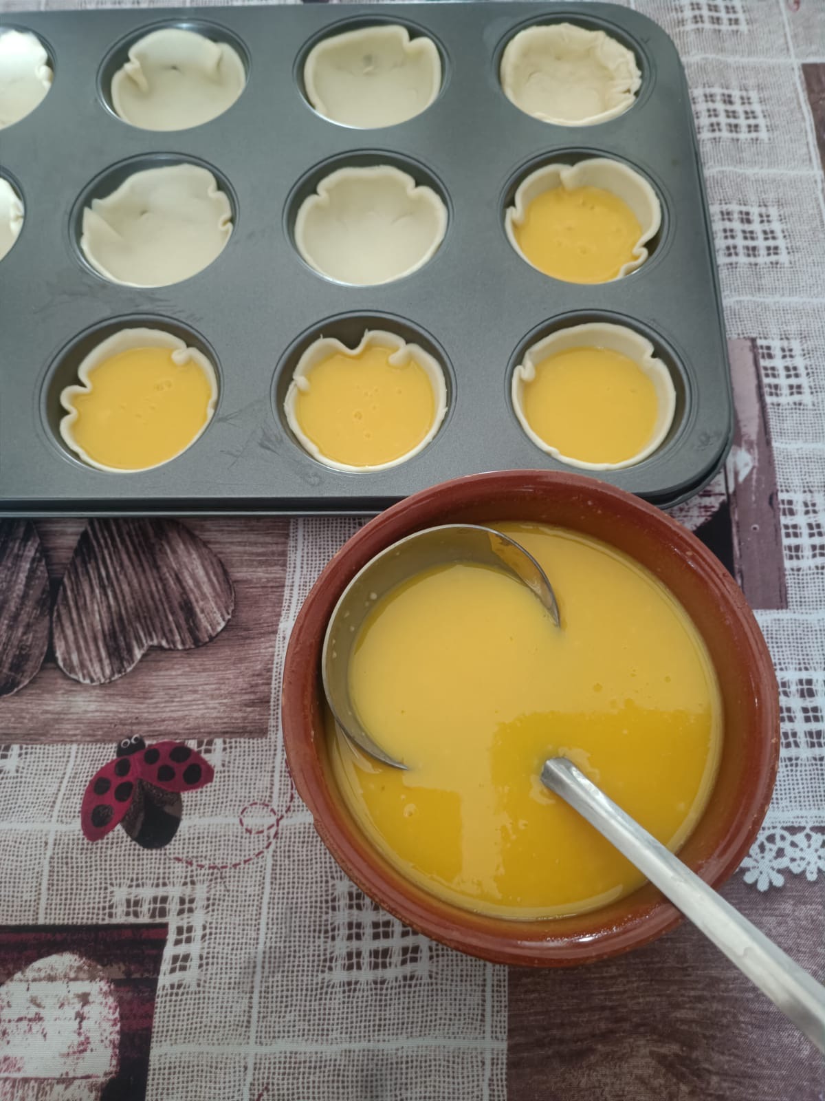 Preheat your oven to 425°F (220°C). Take your muffin tin out of the fridge. Pour the custard into the pastry-lined cups, filling them about ¾ of the way full. Do not overfill, as the cream will bubble up. Bake for approximately 15 minutes. Keep an eye on them: they are ready when the pastry is golden brown and the custard surface has those signature dark brown or black 'leopard spots.' That slightly burnt look is exactly what defines a true Pastel de Nata!